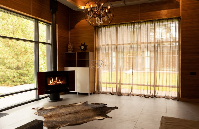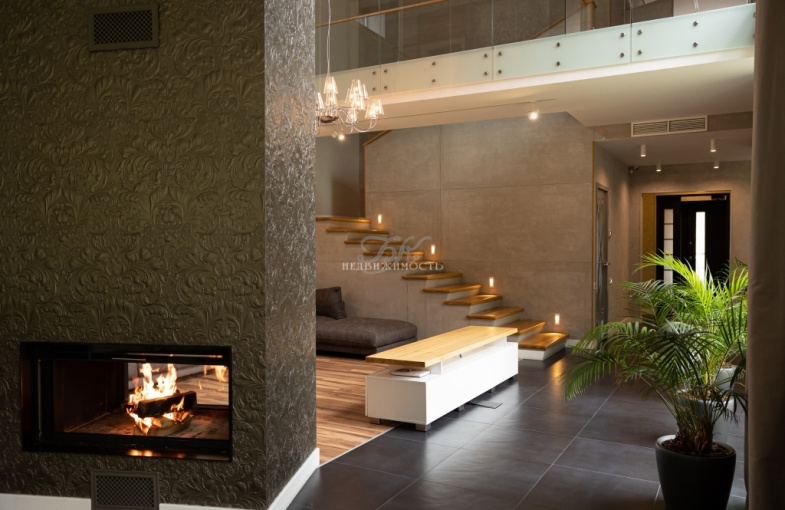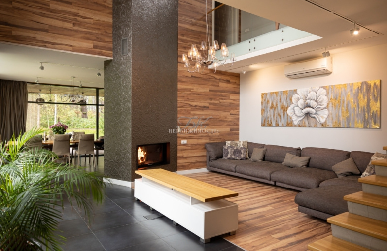 - Гостиная с камином — сердце дома, где собираются за историями и горячим какао.