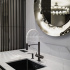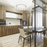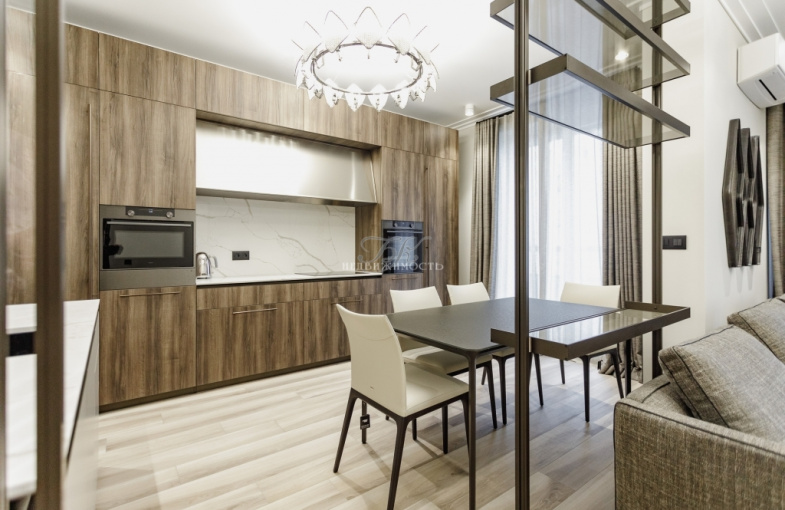 Кухня-гостиная – настоящее место для семейного единения. Здесь гармонично сочетаются мягкие формы, выразительные текстуры и природные оттенки интерьера. Многоуровневое освещение (люстры Patrizia Garganti, светильники Slamp), яркость которого можно контролировать самостоятельно, подходит для создания уютной, тёплой атмосферы. Большая роль отводится функциональности пространства. В зоне кухни (Scavolini, Италия) скрытая система хранения, уместившая максимум функций и скрывающая весь визуальный шум, чтобы не выделять кухню из общего пространства. Обеденная зона представлена фабриками Catelan, Rimadesio. В зоне отдыха акцентным элементом стал диван Arketipo - комфортный и элегантный.