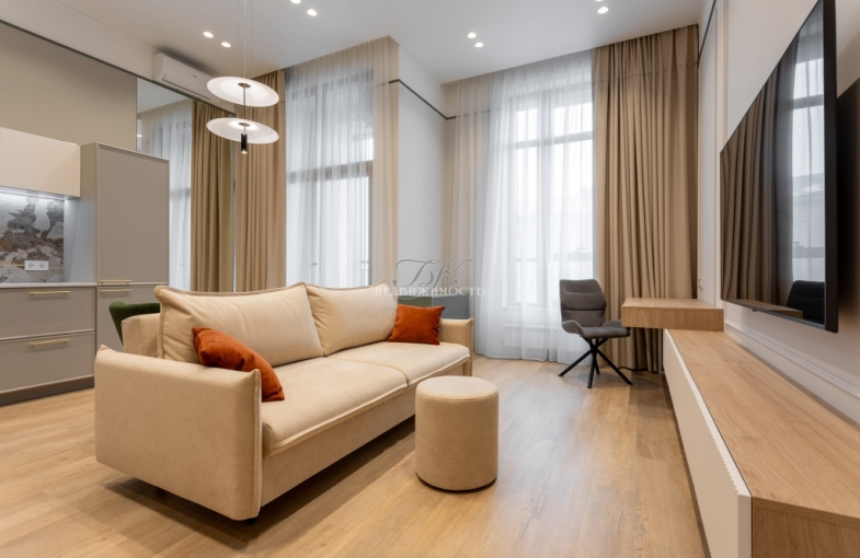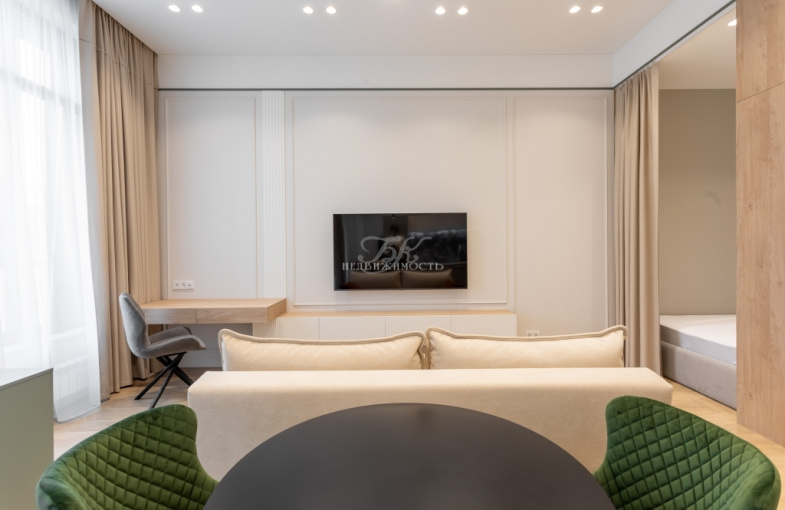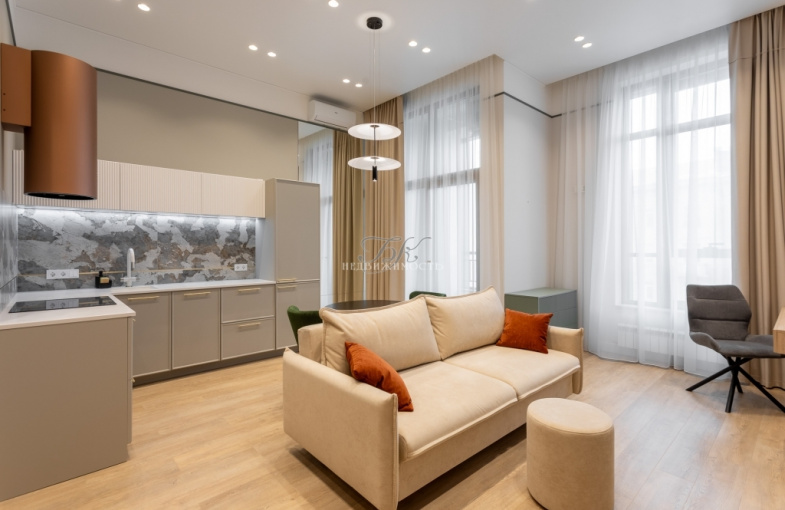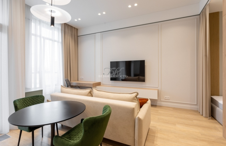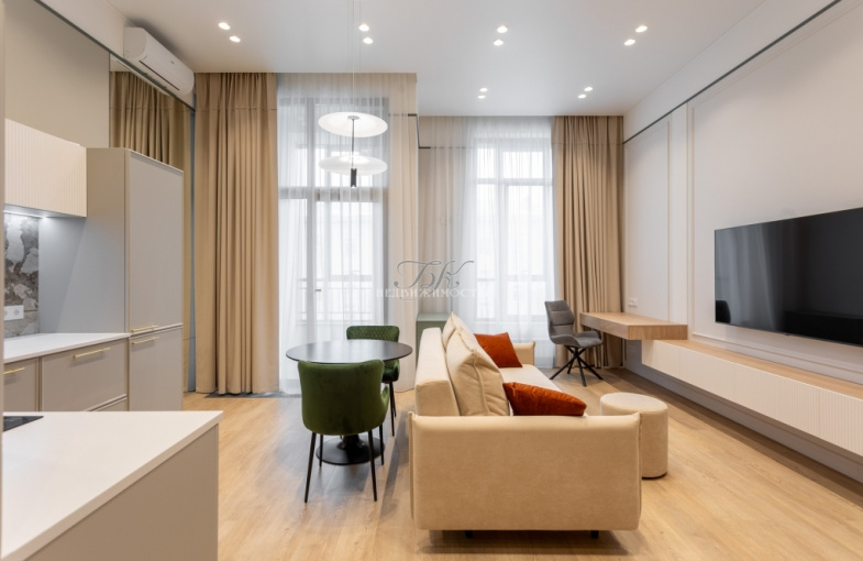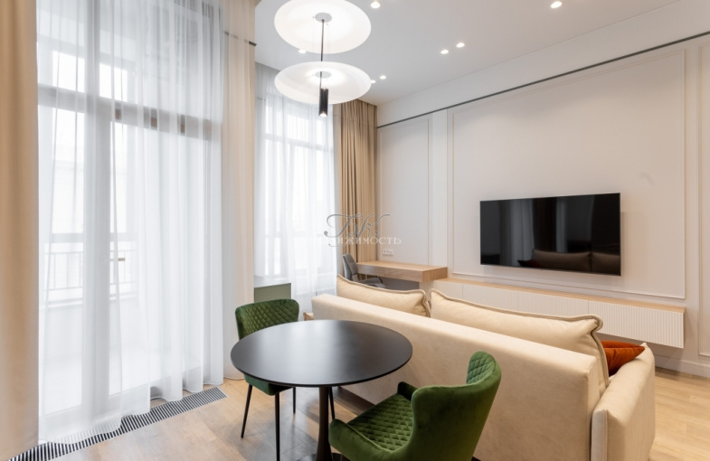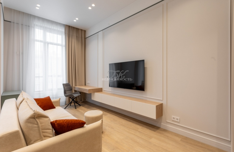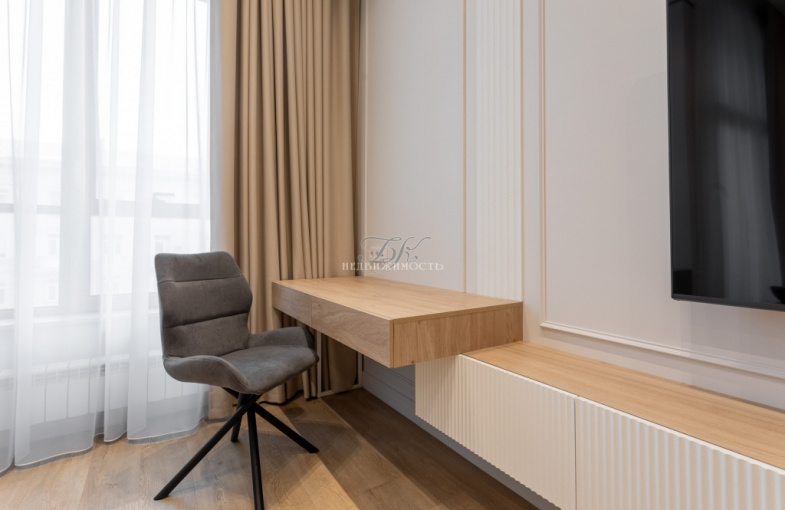 В квартире выполнен ремонт в современном стиле по индивидуальному дизайн-проекту. Увеличенные оконные проемы, светлые оттенки интерьера, высокие потолки (3,6 м) добавляют квартире света и легкости.